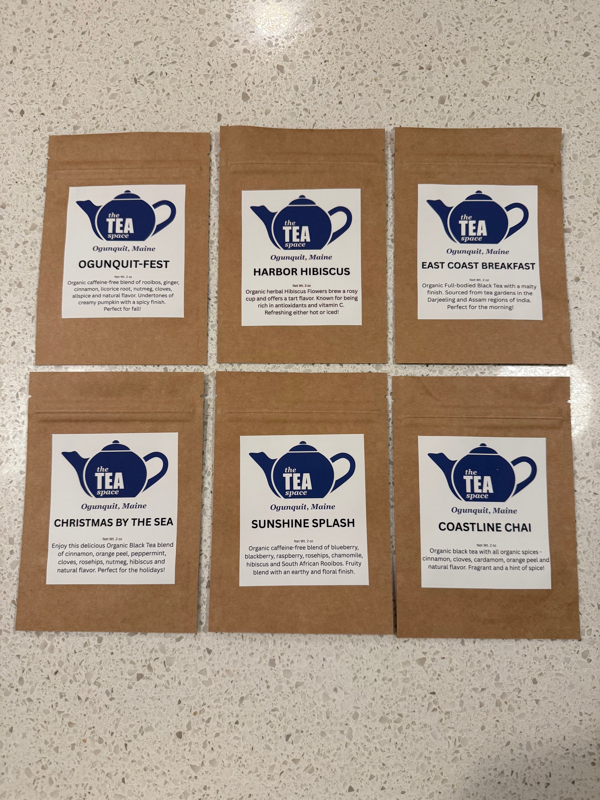 -Moonrise Over Maine: Caffeine free blend of organic blueberries, hibiscus, green rooibos, cinnamon, calendula flowers, cornflowers and natural flavors. Fruity and delicious!